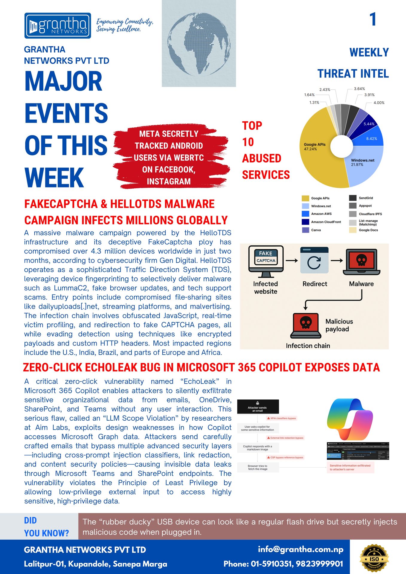 - FakeCAPTCHA and HelloTDS malware campaigns are widespread, impacting millions globally.