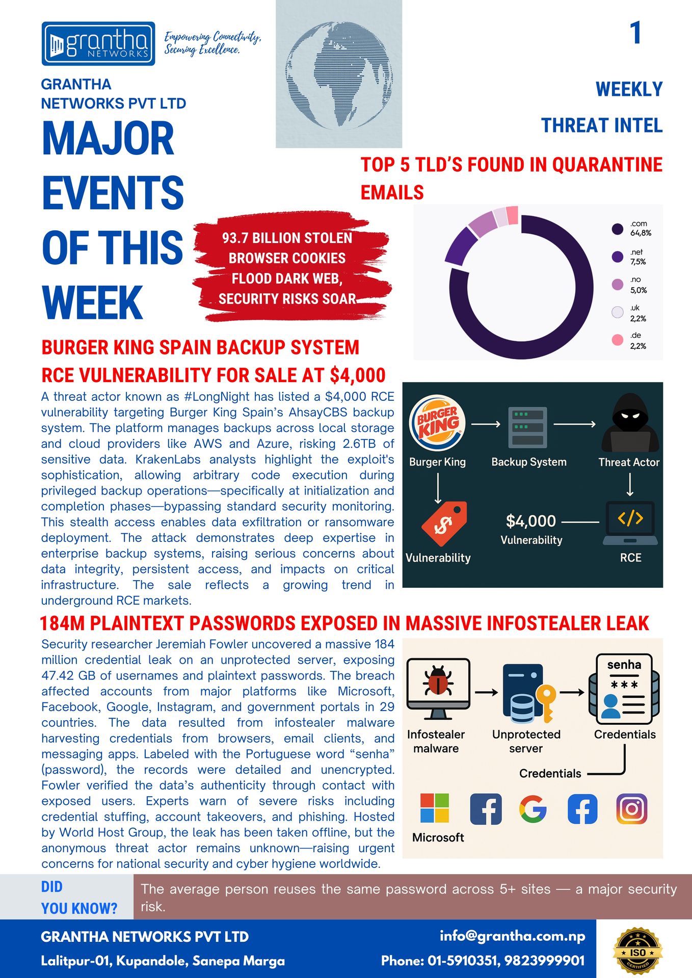 - Recent events include 93.7 billion stolen browser cookies, a 31M customer data leak (AT&T), and a Burger King backup system RCE vulnerability.